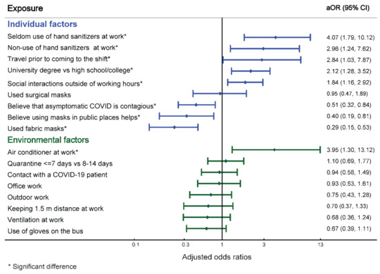 Among the individual factors studied, rare use of hand sanitizers (aOR = 4.1, 95% CI = 1.8–10.1), non-use of hand sanitizers at the workplace (aOR = 3.0, 95% CI = 1.2–7.6), travel before arriving to the shift (aOR = 2.8, 95% CI = 1.0–7.9), higher education (aOR = 2.1, 96% CI = 1.3–3.5), and social interaction outside of working hours (aOR = 1.8, 95% CI = 1.2–2.9) were associated with increased odds of COVID-19 acquisition in the multivariable analysis (Figure 2). Belief that asymptomatic COVID-19 infection is contagious (aOR = 0.5, 96% CI = 0.3–0.8), belief they should use facemasks in public places (aOR = 0.4, 96% CI = 0.2–0.8), and the use of fabric facemasks (aOR = 0.3, 96% CI = 0.2–0.5) had a protective association against development of SARS-CoV-2 infection.