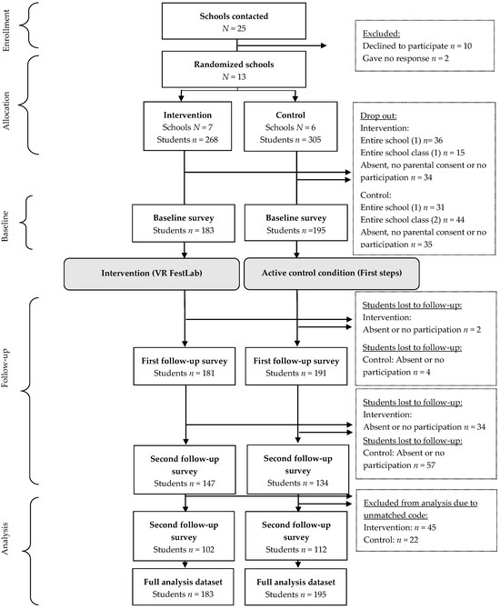 The efficacy of VR FestLab was tested in a cluster-randomized controlled trial (cluster-RCT) (registration number ISRCTN11768445). Schools were randomly assigned (1:1) to the intervention/active control group before the collection of baseline data.