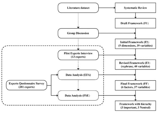 We started with a systematic review of the related literature to identify a proposed factor series for the expert survey. A combined questionnaire and interview were then conducted with relevant professionals to validate the indicator system. Exploratory factor analysis (EFA) and fuzzy synthetic evaluation (FSE) were used to analyze the questionnaire data. The research flow is shown in Figure 1.