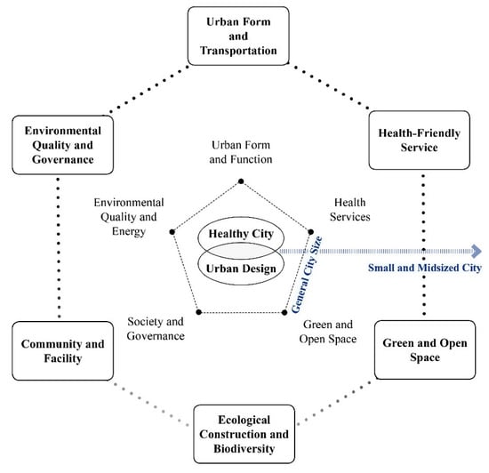 Healthy urban design is recognized as an essential issue that includes addressing the design of urban places for the community to address health inequity [,,]. Discussion of the association between the built environment, urban design, and public health is hardly new. However, many previous studies have focused on big cities [,,,,], general cities without specific attention to city scale, or urban–rural differences [,]. Far more limited literature can be found for small and midsized cities (SMCs). This is possibly caused by limited data openness, with neither environmental data nor health data available for smaller cities [].