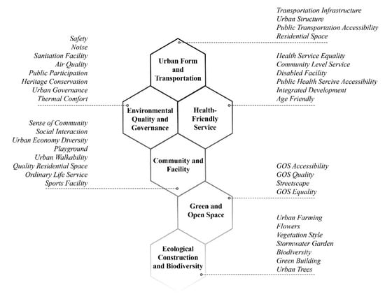 Urban design contributes to a Healthy City in varied ways. At the beginning of the 21st century, research on health issues and the urban environment mainly focused on reducing non-communicable diseases (NCDs), such as obesity and mental health [,,]. After the COVID-19 pandemic, both NCDs and infectious diseases will require attention in terms of urban environmental interventions []. As 54% of the world’s population lives in cities, the role of urban design in promoting a Healthy City needs extensive attention []. After a systematic review of the literature on the theory of the Healthy City within the context of urban design, 5 factors with a total of 40 variables were considered for the basic theoretical framework, and they are summarized and described as follows.