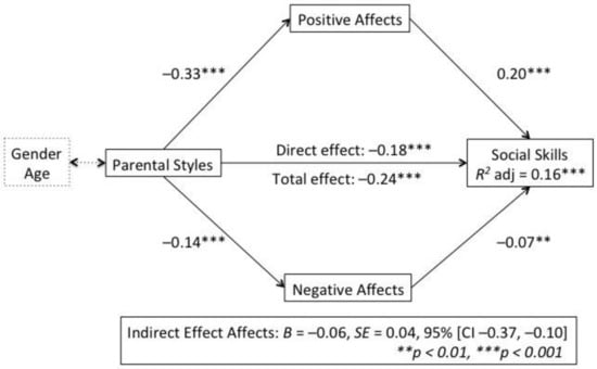 Following the hypothesis, it was found that educational styles have a positive effect on social skills (−0.18) (p < 0.001) and a total effect (direct + indirect effect) of −0.06 (p < 0.001), mediated by positive affects, which demonstrates that affects play a mediating role in the relationship between parenting styles and social skills. The proportion of variance for social skills as explained by the model was R2 = 0.16.
