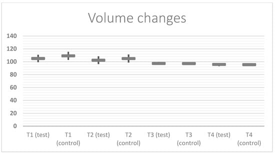 | Volume (Baseline: 100%) Mean Value ± SD (Standard Deviation) | T0 | T1 | T2 | T3 | T4 |