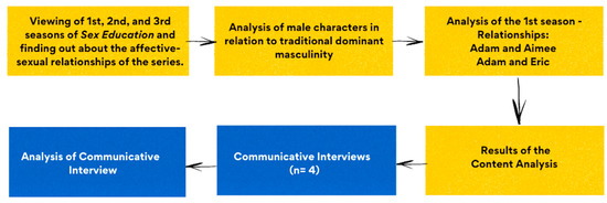 We started by watching seasons 1, 2, and 3 of the series Sex Education in order to know the characters and their relationships, then we started the review by carrying out a communicative content analysis of the first season of the fictional series Sex Education, broadcast by Netflix. Subsequently, communicative focus groups with a communicative orientation were conducted with young girls and boys in relation to two toxic relationships that appear in the eight episodes of the series. Figure 1 shows the data collection process established for this research.