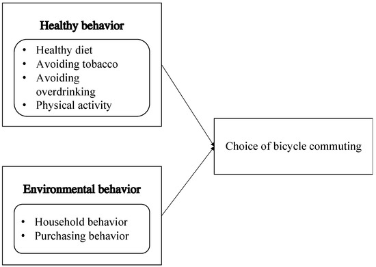 The purpose of this research is to identify the relationships between different types of healthy and environmental behavior and the choice of cycling usage, controlling for demographic characteristics. Since commuting accounts for a large proportion of daily travel demand, this paper focuses on bicycle commute (work/study) trips. We also clearly defined the health behavior and environmental behavior and further refined the factors from different types (Section 2.1). In this paper, data from a survey of adults were mainly used to (1) construct the latent behavioral factors of healthy behaviors and environmental behaviors and (2) identify the relationships between latent behavioral factors and bicycle commuting. We conducted factor analysis to construct the latent behavioral factors of healthy behaviors and environmental behaviors. A binary logistic regression model was utilized to explain the relationship between behavioral variables and choice of cycling usage, controlling for demographic characteristics.