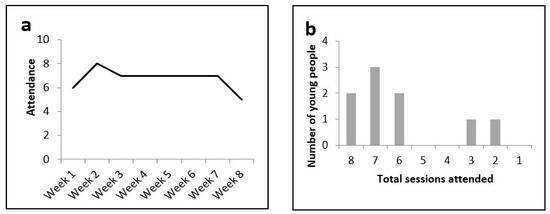 (a) Attendance record during Phase 1 of MST4Life; (b) the total number of sessions attended by each young person.