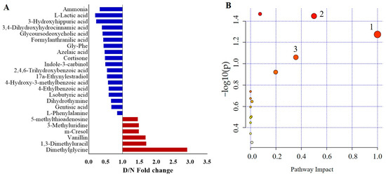 By analyzing the VIP of the first principal component of the OPLS-DA model (VIP > 1) and the p-value of Student’s t-test (p < 0.05), 23 differential metabolites met the screening conditions for the discrimination between the HC and ScD group, of which 7 were screened under the positive ion model and 16 under the negative ion model. The relative change in the above substances is shown in Figure 1A. The pathway impact distribution maps (Figure 1B) show that the three perturbed pathways meet the screening criteria in the ScD for phenylalanine metabolism, phenylalanine, tyrosine, and tryptophan biosynthesis, and nitrogen metabolism.
