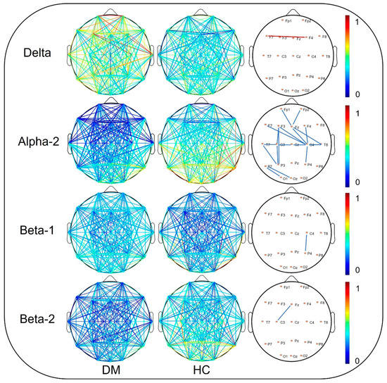 One of the core symptoms that MDD manifests is a loss of interest and expressions of indifference to surrounding emotions [29]. The β-band rhythm mainly occurs in the frontal lobe, related to cortical excitability, and it reflects emotional and cognitive processes [30]. The frontoparietal network, the executive control network, is mainly involved in the advanced cognitive regulation of negative emotional conflicts [31,32]. The topography of brain network connectivity showed that the functional connectivity in the β-band was weakened in the frontal and parietal lobes of female college students with ScD. Kaiser et al. showed that functional connectivity within the frontoparietal control network was significantly reduced in patients with DMM [33]. The reduced Lp and increased Eglobal of functional brain networks in the β-band of the ScD group imply the functional brain networks associated with depressive mood regulation have been disrupted, with a tendency to shift to random networks. Random networks have low modular information processing or fault tolerance [27]. The randomization process has been observed in the functional brain networks of patients with other neurological or psychiatric disorders, such as Alzheimer’s and schizophrenia [34].