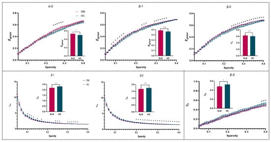 Topology properties of brain network based on sparsity threshold (0.05 < S < 0.4); the bar chart represents a comparison after averaging all thresholds with significant differences. * p < 0.05. ** p < 0.01.