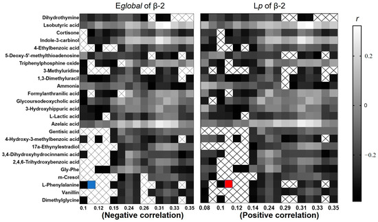Correlation between Eglobal and Lp of functional brain network and differential metabolites; × represents a significant correlation. The maximum correlation (red and blue square) was found at the sparsity of 0.11.