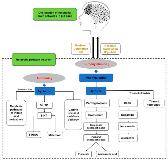 This study showed that phenylalanine levels were negatively correlated with Eglobal, whereas they were positively correlated with the Lp of the β-1 band of the functional brain network in female college students with ScD. Given the above discussion, we found that the β-1 band of brain functional network associated with negative emotion regulation in female college students with ScD tends to be randomized, while the disruption of phenylalanine metabolism and phenylalanine, tryptophan, and tyrosine biosynthetic pathways is mainly associated with a decrease in L-phenylalanine. In conclusion, the disturbance of phenylalanine metabolism and the phenylalanine, tryptophan, tyrosine biosynthesis pathways cause depressive symptoms and changes in functional brain networks. The decrease in the L-phenylalanine level may be related to the randomization trend of the β-1 frequency brain functional network.