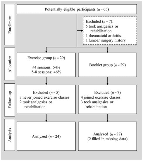 In this study, 65 of the hospital staff members were included after excluding five on analgesics, one diagnosed with rheumatoid arthritis, and one who had undergone lumbar surgery in the past. Twenty-nine cases were in the exercise and booklet groups, respectively. A total of eight core stability exercise sessions were implemented between 10 March 2021 and 12 May 2021. The schedule was rearranged twice because of weather issues. Before the posttest, five patients were excluded from the exercise group due to non-participation in the exercise course (3/5) and the use of analgesics or physical therapy (2/5); seven patients were excluded from the booklet group due to participation in the exercise program (4/7) and the use of analgesics or physical therapy (3/7). Finally, 24 cases in the exercise group and 22 in the booklet group were included in the analysis. The posttest data for two individuals in the booklet group were missing, and the missing data replacement method was used for these two datasets (Figure 1).