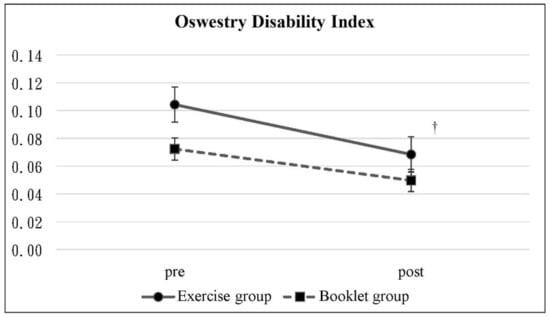 Oswestry Disability Index: Mean scores with 95% confidence intervals at the pretest and posttest. † Significant difference between pretest and posttest in the exercise group.