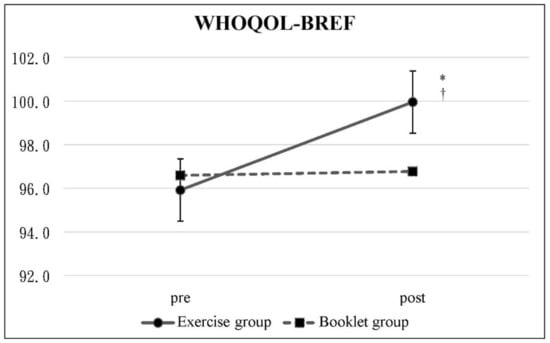 WHOQOL-BREF: Mean scores with 95% confidence intervals at the pretest and posttest. † Significant difference between pretest and posttest in the exercise group. * Significant difference between the two groups.