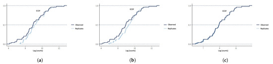 Comparison between the empirical distribution of the logarithmic observed COVID-19 counts and the distributions of simulated/replicated samples from the posterior predictive distribution based on M1, M3, and M4. (a) M1: naive Poisson model; (b) M2: under-reporting only; and (c) M4: under-reporting and spatial.