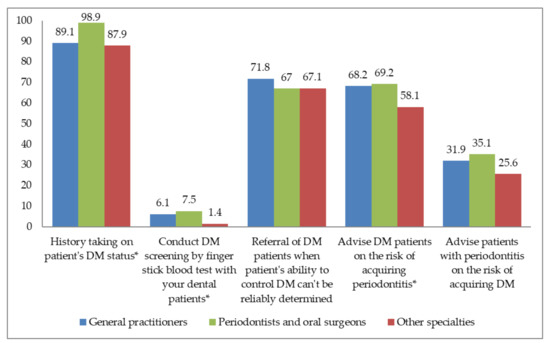 Management of DM screening in dental clinics according to dental specialties. * statistically significant at p < 0.05. DM: diabetes mellitus.