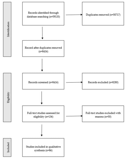 The initial search returned 59,133 studies: 10,435 from Scopus, 45,622 from PubMed, and 3076 from Web of Science. However, the majority of identified papers (50,717) were duplicates (Figure 1). Therefore, 8416 proceeded to title and abstract screening. Two independent reviewers (MOP, MG, ABJ, or BW) screened each of the eligible studies. Another pair of reviewers (including AW) solved conflicts by reaching a consensus. For the full-text review, 136 publications were selected. Two independent reviewers (MOP, MG, ABJ, or BW) qualified each study in the full-text review stage. Another pair of reviewers (each including AW) solved conflicts, if necessary. A total of 33 studies were excluded as irrelevant to the topic, 8 because they were in a language other than English, 5 were editorials or letters, 2 were duplicates, the full texts were inaccessible for 2 more. Finally, 86 studies qualified for data extraction (Supplementary Table S2).