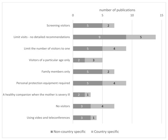A total of 20 publications recommended specific policies for visitors, while only 14 gave general recommendations (“limit visits”) (Figure 3). The two most common were limiting the number of visitors to one [25,48,54,56,58,60,61,62,63] and using personal protective equipment (PPE) [25,27,28,47,63,64,65,66,67]. It is noteworthy that all the recommendations that did not allow more than one visitor were published within the first three months of COVID-19, except Boeling’s second article from October 2020 [48]. Seven studies [39,41,53,55,56,68,69] recommended banning all visiting. These recommendations were dispersed over the period under review. They were issued both on non-country specific [39] and on a national [53] level, over one year after the spreading SARS-CoV-2 infection was recognized as a pandemic. Five of the publications [39,55,56,68,69] suggested prohibiting visits only when a child or the mother was suspected of SARS-CoV-2 infection or was already diagnosed with COVID-19. Moreover, three other papers recommended visits only when the mother’s illness did not allow her to take care of the newborn [49,50,66]. When visits were allowed, the authors recommended additional specific requirements. In seven articles, we found further conditions to be met by visitors, mainly related to the degree of relationship to the mother [25,28,49,60,61,65,67], the majority of which were published no later than October 2020. Four [49,60,61,67] limited visits to family members, not indicating the exact relationship with the mother, two recommended the father only [28,65], and one restricted visitors to people living in the same household [25]. Five publications [25,28,30,58,68] included requirements on visitors’ age. A total of 3 papers excluded children [28,30,58], 1 excluded [68] adults over 60 years old, and 1 [25] limited visits to adults aged between 18 and 59 years. Universally testing visitors for SASR-COV-2 infection was recommended in seven publications [25,28,48,56,61,63,65]. Four papers proposed using video and teleconferences as an alternative to direct visits to labor and delivery units [64,65,70,71].