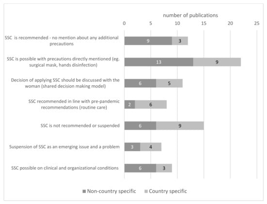 Recommendations against SSC were found in 27% of the papers addressing this issue (15 papers) [25,26,28,29,30,37,48,53,61,62,64,68,89,90], including 1 paper in which different kinds of Brazilian recommendations, mostly prohibiting SSC, were recalled and discussed due to being controversial and potentially negatively impacting breastfeeding success, but the authors did not formulate their own recommendations [91]. Half of the recommendations (7 studies) among those against SSC were published in the second and third quarters of 2020 [25,26,37,61,62,64,68].