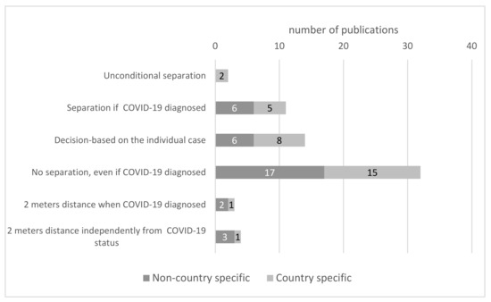 At the opposite extreme, only two papers recommended unconditional separation. None of them was published on a non-country-specific level. The publications came from the first three months of the pandemics and referred to China [31] and Russia [45]. A total of 12 publications (6 of them on a non-country specific and 5 on a local level), published between March 2020 and February 2021, recommended separation when the mother or the newborn had SASR-CoV-2 infection confirmed [27,28,30,35,40,58,61,64,77,95,96]. However, it should be noted that three papers recommend separation only when the mother is too sick to take care of the neonate [35,58,96]. Chawla et al. [61] suggested not to rooming-in when both mother and child are positively diagnosed with COVID-19.