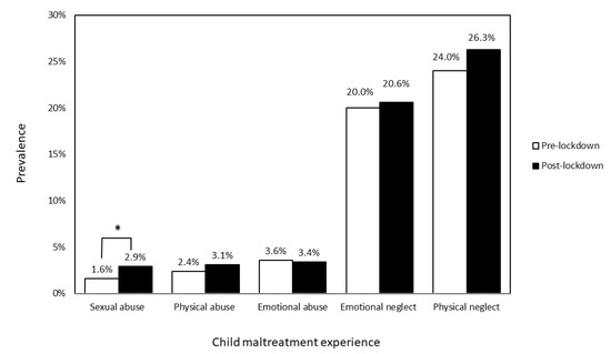 The prevalence of child maltreatment pre- and post-lockdown. * Bonferroni correction p < 0.05, data shows percentage and percentage error.