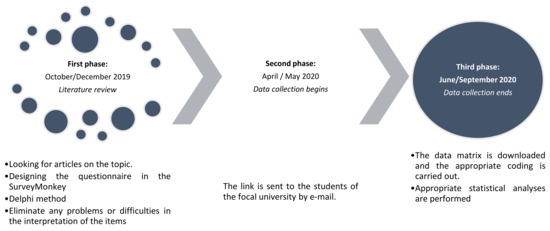 As Figure 1 shows, first, instruments from previous international studies on the use of digital technologies are reviewed and analysed in order to articulate the variables analysed in the ad hoc questionnaire. After designing the questionnaire in the SurveyMonkey online software (Momentive—SurveyMonkey Europe UC, Dublin, Ireland), and following the Delphi method, it is sent to professionals in the field of specialisation, in order to verify its functionality and operability, and to eliminate any problems or difficulties in the interpretation of the items. Once modified, the link is sent to the students of the focal university by e-mail. Upon expiration of the open time set, the link is closed, the data matrix is downloaded, the appropriate coding is carried out, outliers are removed, and the appropriate statistical analyses are performed.