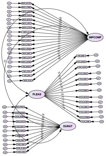 Three-factor measurement model of CFA confirmatory factor analysis of the DTS: IMPCOMP Importance-Competence; PLEAS Pleasurable; DURAT Duration or time.
