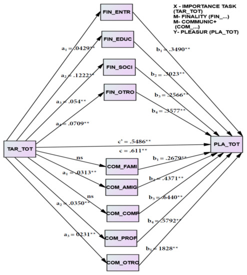 In particular, the nuance they introduce, both the purpose of using digital tools and who communicates with them, must be considered for a correct understanding of the equation. The importance of the digital activity (XACT) directly predicts (c′) satisfaction with its use (YSAT) with a highly significant coefficient (c′ = 0.5486, p > 0.001); it also indirectly predicts the mediating variable purpose (MPUR) in a statistically significant way, both for entertainment (a1 = 0.0429, p < 0.0036), education (a2 = 0.1222, p < 0.001), social (a3 = 0.054, p < 0.0004), and other (a4 = 0.0709, p < 0.001). The mediating variables purpose of the use of digital tools (MPUR) indirectly predict satisfaction with digital tools (YSAT), each for entertainment (b1 = 0.3490, p < 0.001), education (b2 = 0.3023, p < 0.001), social (b3 = 0.2566, p < 0.001) and other purposes (b4 = 0.3577, p < 0.001). The bootstrapping intervals obtained to identify the coefficients and their statistical significance show that the total effects of X on Y have a coefficient c = 0.611, so the relevance of the indirect effects of the importance of the digital activity (XACT) through the mediating variables (MPUR) on the satisfaction variable with digital activities or outcome (YSAT) is relevant and should be considered for a correct understanding of the use of tools, playing a role from highest to lowest, that of other purposes, followed by entertainment, education, and finally the social purpose.