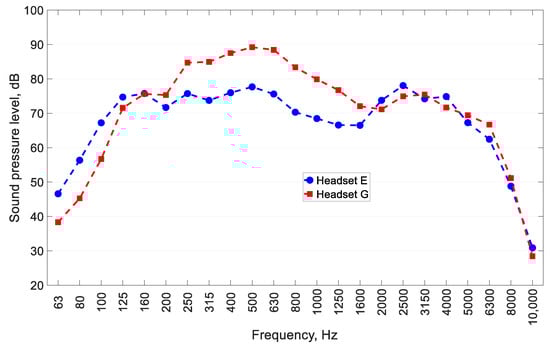 Each of the 12 headsets included in the study was placed on the head of the manikin, one after another. Then, a test signal was generated from Laptop 1. The signal was generated three times—for volume control levels of 75%, 90% and 100%. The level of 75% represents the subjective perception of that at which good audibility of the test signal is achieved for all the measurement situations. The level of 100% represents the situation of the greatest possible exposure to sound. The level of 90% is an intermediate setting between the two previous situations. The headset was connected to the computer via a USB port or a 3.5 mm jack. For headsets equipped with both types of connectors, the measurement was carried out (in both cases) without removing the headset from the manikin’s head. A headset connected to the computer via wireless Bluetooth was also used. The recording of the acoustic signal reproduced by the headset started after the test signal was triggered. This recording was performed using the microphones of the manikin connected to the measurement module. Then, the BK Connect 2019 (Hottinger Brüel&Kjær A/S, Virum, Denmark) software was used to establish the sound pressure level (SPL) in 1/3-octave bands, the L