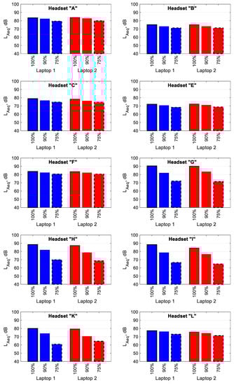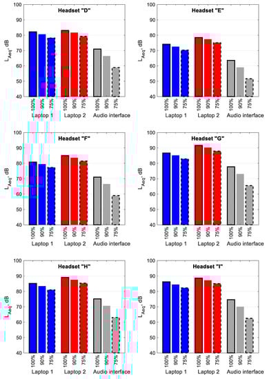 Aeq changes were not very significant and averaged around 1.5 dB (when the signal volume control level changed from 100 to 90%) and around 2 dB (when the signal volume control level changed from 90 to 75%), regardless of the headset and laptop model. More significant changes related to the signal volume control level in L