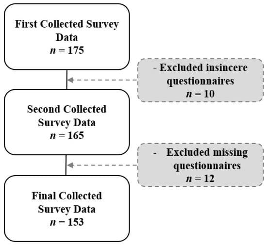 This study was conducted with the approval of the Bioethics Review Committee of Silla University (1041449-202012-HR-001). The subjects of this study were recruited using the convenience screening method for dental hygienists in Korea, and the survey period was conducted from 1 February to 29 May 2021. For ethical consideration of the subject of the study, a structured self-contained survey was conducted on each subject who signed the consent form. The survey method was self-filling, and the dental hygienists filled out the questionnaire themselves. Based on Cohen’s power analysis, G*power 3.1.3 [23] was used, and the minimum sample required under the condition of a 5% significance level (two-tailed), a power of 80%, and an effect size of 0.5 was used. We planned to retrieve a total of 151 questionnaires, but 175 questionnaires were distributed in consideration of the dropout rate. As 22 questionnaires were not answered or were insincerely answered, 153 duly accomplished questionnaires were finally used (Figure 1).