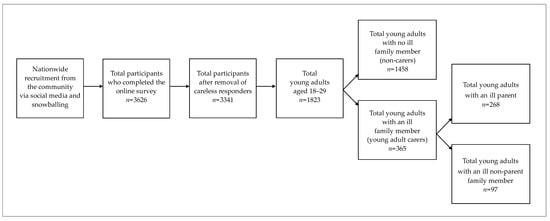 A total of 1823 young adults aged 18–29 completed an online survey between 19 January 2021 and 2 February 2021 during the second Italian mandatory lockdown. Most of the studies on young adult carers have recruited from higher education student populations or from organizations that support formally identified young carers and young adult carers. In the present study, we recruited young adults from the general community, with no requirement for participants to self-identify as a carer. Regarding the latter, given the evidence that young people in caregiving roles do not always identify as carers [,], investigating only those who self-identify as carers may exclude young people who have substantial care responsibilities but do not identify as a carer. Although most research on young adult carers has focused on the 18–24 years age range, we used the broader 18–29 range in this study. There is widely published data showing that in high-income countries emerging adulthood typically extends up to age 29, with parallel trends towards longer time in education and later entry into marriage and parenthood []. This revised extended developmental period for emerging adulthood is now widely used (e.g., see review []).