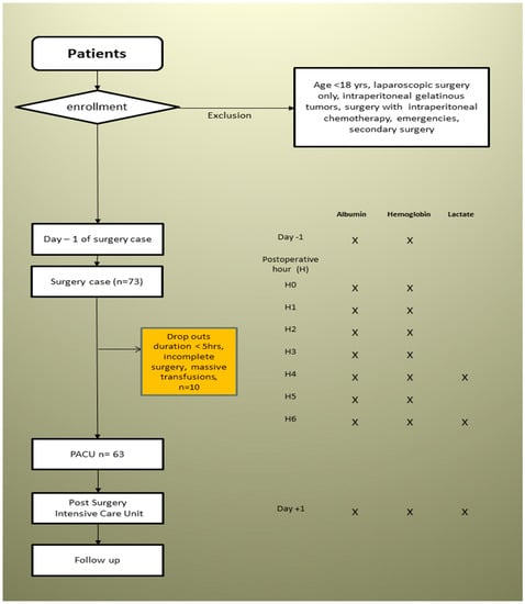 The exclusion criteria were age under 18, laparoscopic surgery, intraperitoneal gelatinous tumors, surgery with intraperitoneal chemotherapy, emergencies, and an expected intervention duration of less than five hours. Other exclusion criteria were failure of arterial catheter placement and actual surgery duration of less than five hours. The transfusion of blood products in the first five hours of the operation resulted in termination of the protocol; however, the values already collected were kept.