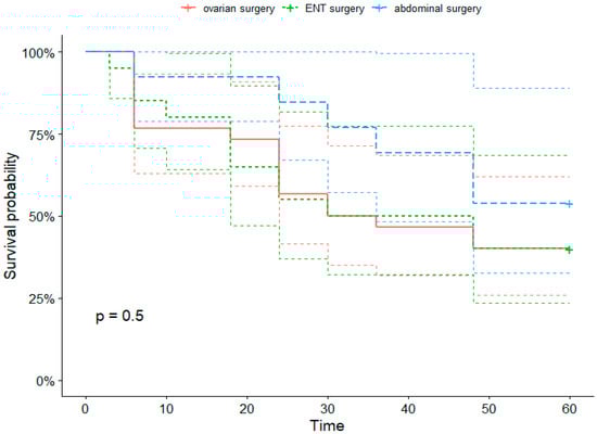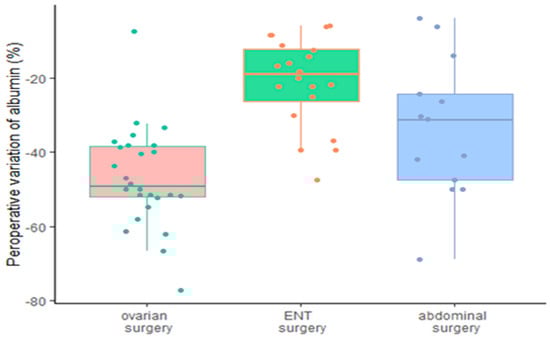 Decreases of 14 and 19% in cut-off values for ALB have been suggested for recognizing patients at a high risk for complications after gastric cancer resection [,]. The role of albumin as an independent prognostic marker in ovarian tumors is debated [,]. The decrease in plasma albumin concentration following surgery is well known and documented [], with these authors finding it to be a significant predictor for clinical outcomes in non-cancer surgery; however, the temporal pattern and the effect of different types of surgery are not well assessed or understood.