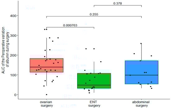 The characteristics of the patients were expressed as mean (SD) for continuous variables and as frequencies (%) for categorical variables. As the number of patients was not equal between the surgery groups and the duration of surgeries was not the same, a two-way ANOVA could not be used. We compared the groups using a one-way ANOVA of the area under the curve (AUC) of the intraoperative variation of albumin and hemoglobin.