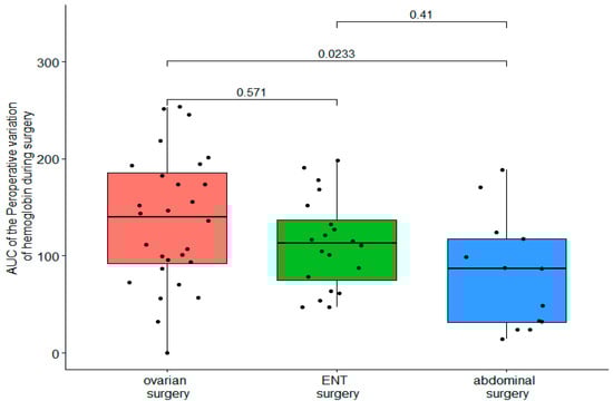 Comparison of the AUC of intraoperative variation of hemoglobin between surgery groups.
