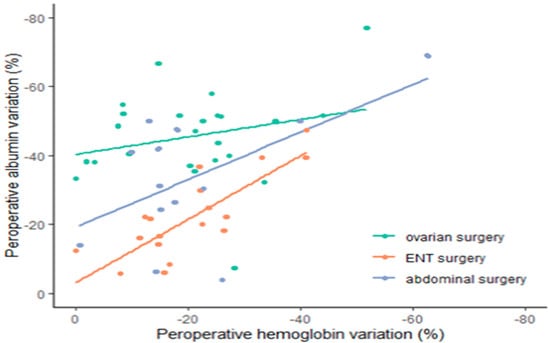The correlation between albumin and hemoglobin loss is illustrated in Figure 5. Albuminemia showed a decrease of approximately 20% at H + 6 in the ENT group, 40% in the ABD group, and 45% in the ovarian surgery group.