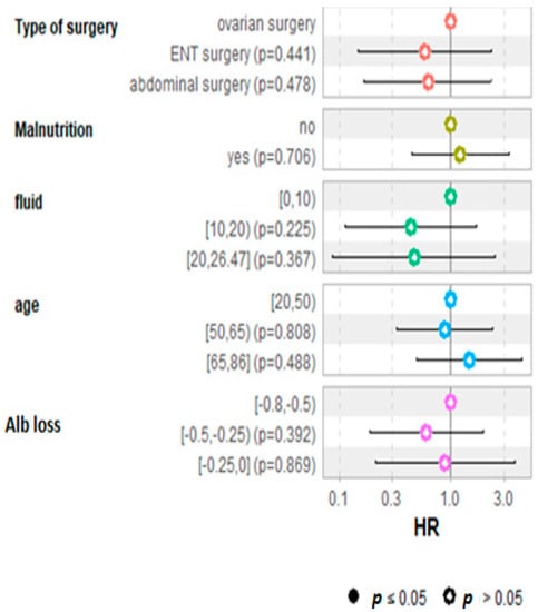 The demographic characteristics of the patients with regard to outcome considering BMI, age, ASA score, malnutrition status, cardiovascular disease, smoking habit, preoperative serum albumin, creatinine clearance, and types of surgery were not different between survivors and non survivors. The Kaplan–Meier analysis with regard to the outcome at five years is shown in (Figure 6). No significant difference or correlation was noticed with regard to the outcome or the decrease in albumin. The Cox regression hazard ratio regression for survival analysis did not detect any significant factors in the five-year survival analysis (Figure 7).