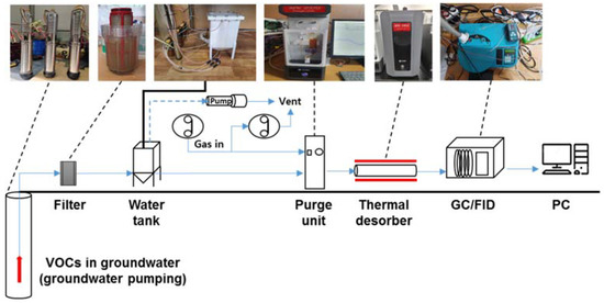 VOC monitoring has mainly been conducted during on-site sampling, which is followed by laboratory analysis [11,12]. Such monitoring inevitably requires transfer time of the samples along with pretreatment (sometimes conducted), possibly altering the original sample quality. Thus, the demand for fast and continuous VOC monitoring is increasing; consequently, more attention has been paid to portable VOC sensors. As a representative portable VOC sensor, the photoionization detector (PID) has become commercially available; additionally, the combination of PID with gas chromatography (GC) has been recently investigated for monitoring VOCs in the water and air [13,14]. However, most PID sensors are non-selective to a particular VOC, and the detection limit is relatively lower than that of conventional detectors, such as flame ionization detectors (FIDs) [15]. Since the regulations on VOCs in natural and built environments are often established by individual components such as benzene and toluene [16,17], separate detection of the representative VOC components (e.g., BTEX) with high accuracy is required for continuous VOC monitoring. In fact, the individual VOC components have been determined by a thermal desorber (TD) and GC system in indoor air quality monitoring [18,19], and it is desirable to apply such a system in the soil and groundwater. Since VOC monitoring in the subsurface has been conducted either in the soil or in groundwater [20,21], it is necessary to monitor VOCs simultaneously in both the soil and groundwater to determine VOC migration and mitigation in the subsurface.