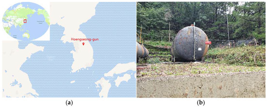(a) Site location (Hoengseong) in Republic of Korea and (b) the contamination source (a rusted oil tank) at the site. Additional pictures of the monitoring wells at the site are shown in Figure S1.