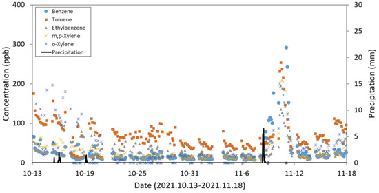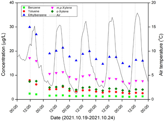 Daily fluctuation patterns of BTEX concentrations, determined using the systems established in this study, and air temperature observations (solid line) conducted during 19–24 October 2021. During this period, no rainfall occurred.
