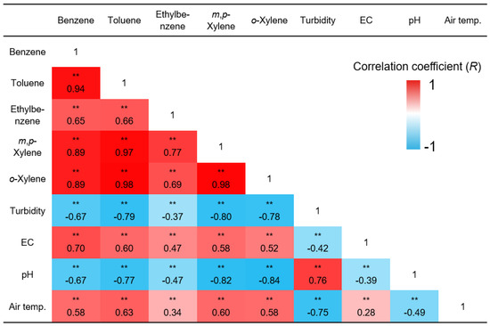 Results of correlation analysis among BTEX concentrations, turbidity, electrical conductivity (EC), and pH of groundwater, and air temperature (n = 115). ‘**’ indicates a relationship exhibiting a strong correlation (2-tails) for p < 0.01.