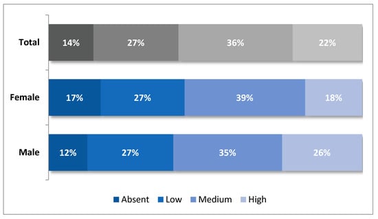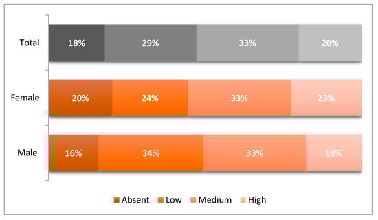 Similarly, the female gender roles indicator shows that 20% of respondents had a high response level to this stereotype, 33% had a medium level, and 29% had a low level. In this case, only 18% of them stated that these roles can be played by both men and women. Indeed, also for female roles, the percentage of adherence to the medium-high modalities was about half of the sample (53%) (Figure 2). However, observing the high modality, we find an inverted situation with respect to the acceptance of traditional male roles (Figure 1). The adherence to female gender roles is higher among girls rather than boys (23% of girls and 18% of boys). This first result shows how the internalisation of gender stereotypes is traceable already at this age, as boys and girls start identifying themselves with known behavioural models, reflecting the type of socialisation to which they have been exposed until that moment.