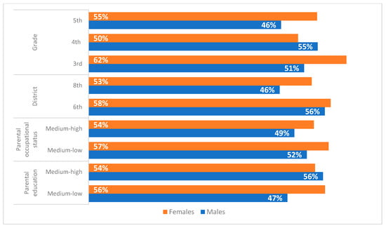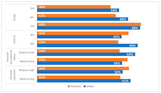 Levels of adherence to female gender roles by sex (% of medium and high levels by school grade, district, parental occupational status and parental level of education).