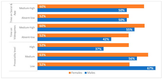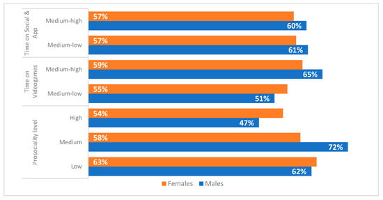 The percentages of respondents who have internalised male and female gender roles, combining medium and high levels of adherence in relation to the indicators measuring the levels of prosociality, the screen time on videogames and the screen time on social media and applications are shown in Figure 5 and Figure 6.