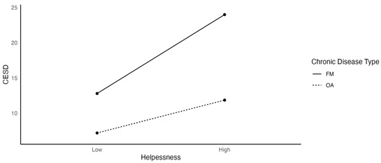 Specifically, Figure 3 shows a positive relationship between helplessness and depression, and that this relationship was stronger for FM (β = 7.228) than for OA patients (β = 3.011). These results indicated that when levels of perceived helplessness were high, depression scores were also higher, and a steeper regression slope indicated that FM patients were particularly sensitive to changes in perceived helplessness.