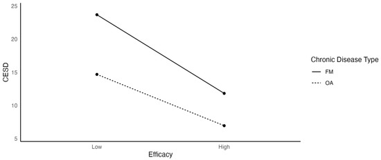 Figure 4 shows that self-efficacy was negatively associated with depression, and the negative relationship was stronger for FM (β = −0.311) than for OA patients (β = −0.203). Higher perceived self-efficacy was associated with lower depression scores especially for participants with FM.