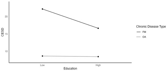 Figure 5 shows that education acted as a buffer for depression among FM (β = −1.846) participants, but not for OA (β = −0.059) participants. Low education in the FM group was associated with higher depression scores, whereas depression scores were stable across education levels among participants with OA.