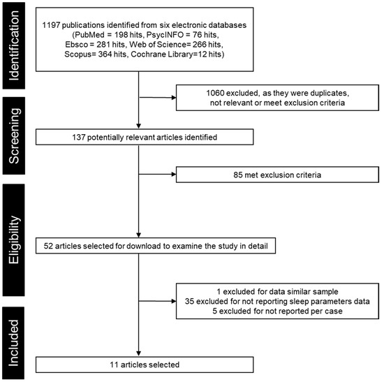 In parallel with our serial reviews [18,19] concerning sleep in RTT following the PRISMA 2009 guidelines [20] (PROSPERO: CRD 42020198099), we extracted all RTT case and case series designs; that is, data were selected from the case and case series studies published in English in peer-reviewed journals on RTT with clinical or genetic diagnosis. The PSG data of those RTT cases should be reported numerically or graphically, allowing measurement as numerical data. Studies published up until 6 February 2022 were included (Figure 1 and Supplemental Table S1). RTT cases reported with other central nervous system complications (e.g., neurofibroma) [21] were excluded.