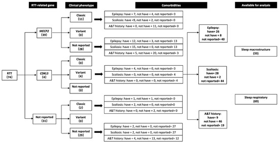 Number of cases in stratification analysis. A&T: adeno(tonsil)ectomy surgery; CDKL5: cyclin-dependent kinase-like 5; MECP2: methyl-CpG-binding protein-2; RTT: Rett syndrome.